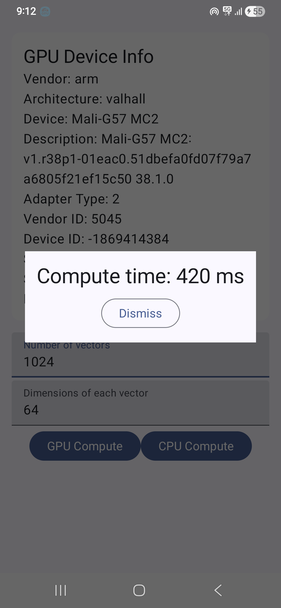 }We now have all components required to execute our WGSL script on the device’s GPU. We create a function, WGPUComputeShader.execute() that accepts vectors: Array<FloatArray> and a result callback function onComplete,